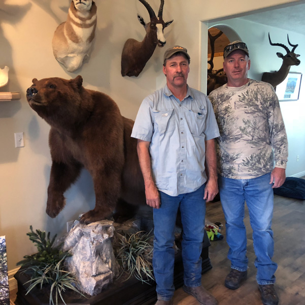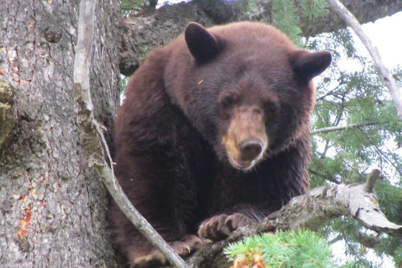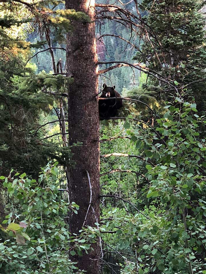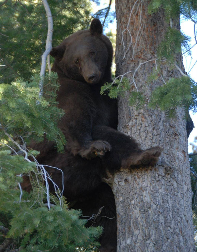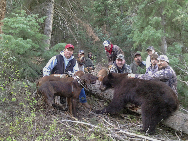 Bob: "The dogs chased this large bore to its den, where it ended up climbing a nearby tree. We could see a large fresh gash across the bear's nose [partially visible on the bear above or to the left]. After sending our boys into the den to take a picture, they quickly discovered that the den was occupied by a sow!