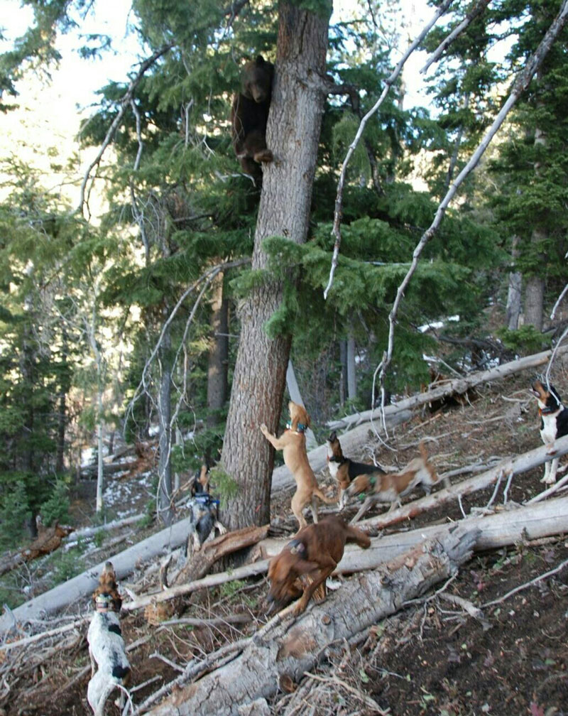 "The bore probably headed for his den, got wacked by the sow, then climbed the tree after meeting our whole pack of dogs."