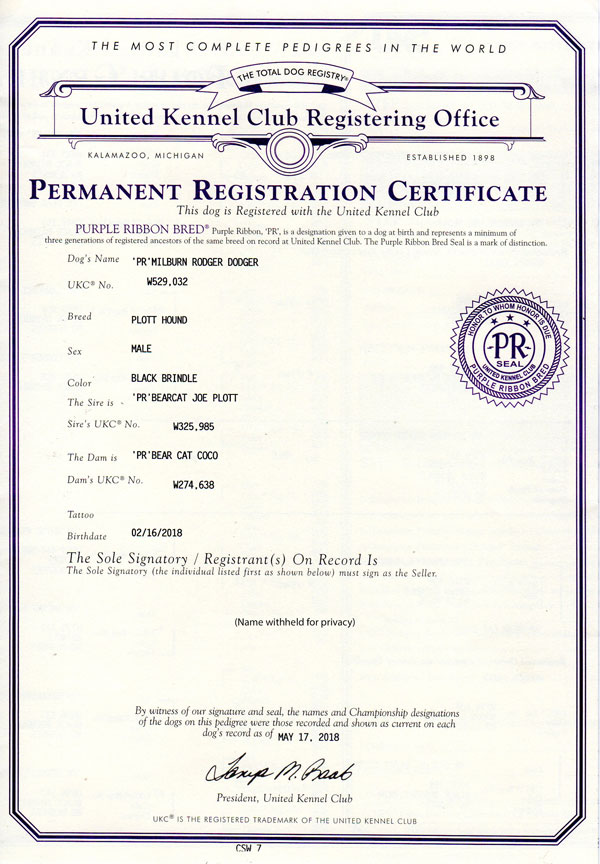 Bob's kennel will consist of two Plott lines. Otis represents the first line, a Plott mix carefully bred for the character traits found in aggressive, cold-nosed bear and mountain lion Plotts. This registered puppy is the foundation Plott of the second line.